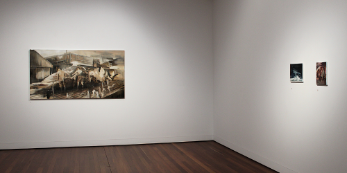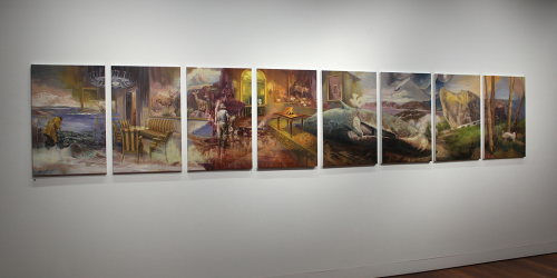 Motifs from museum interiors, taxidermy displays, and ambiguous or idealised landscapes emphasise how institutional settings and systems shape our understanding of the natural world. These references also call attention to the tension between preservation and loss that often sits within such spaces.